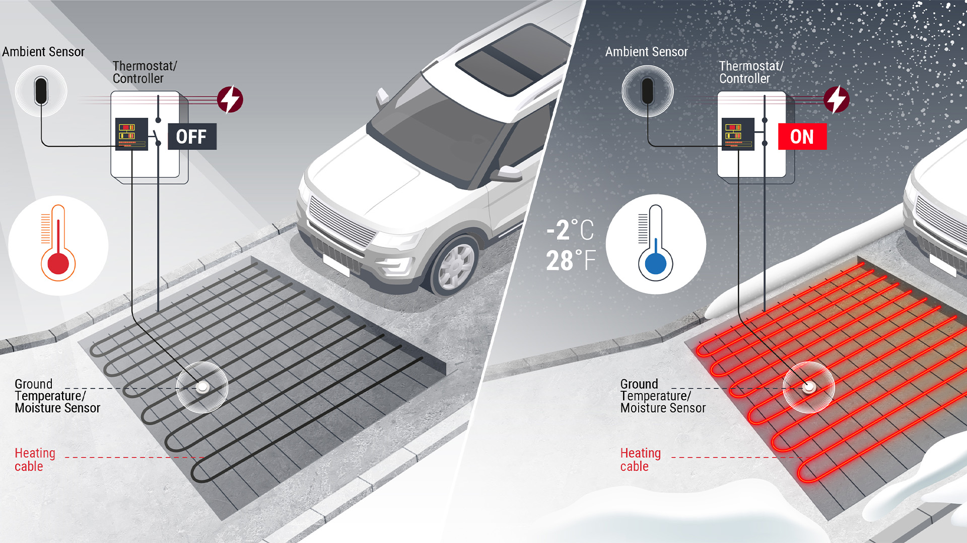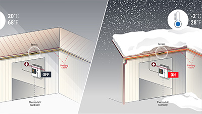 融化后再凝結的冰會損壞屋面和天溝。沉重的冰柱可能會掉落而造成損傷。瑞侃系統在天溝內的冰雪積聚之前就將其融化。確保融化的冰雪順暢地通過天溝和落水管排走。